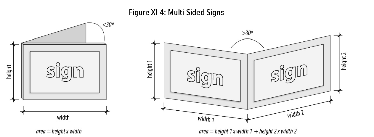 Multi-sided signs. Unless otherwise expressly stated, when the sign faces of a multi-sided sign are parallel or within 30 degrees of parallel, only one side is counted for the purpose of determining the area and number of signs. If the sign faces are not parallel or within 30 degrees of parallel, each sign face is counted as a separate sign. If the size of one sign face is larger than another, the size of the largest sign face is the area of the sign.