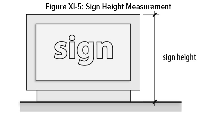 Sign height. The height of a sign is measured as the vertical distance from ground level to the top of the sign. The sign height includes the sign base.