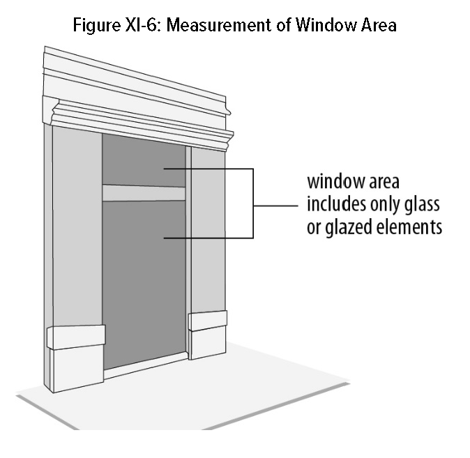 Window area. The area of a window includes only the glass or glazed elements of the window. Frames, mullions, and similar features are not counted as part of the window area. Limits on window coverage apply to each individual window and door. The area of a window sign is based on the entire outer dimensions of the sign, regardless of whether the sign includes see-through mesh or other transparent or semi-transparent material.