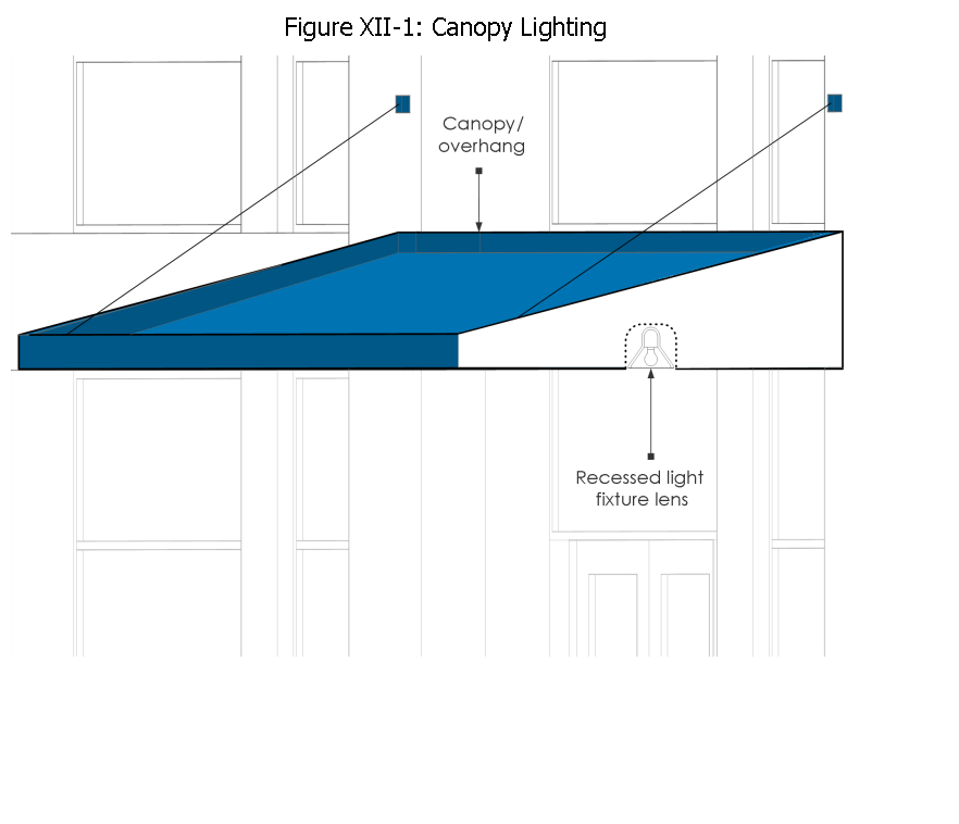 Canopy lighting. Light fixtures installed in canopies, pavilions, drive-through bays, or similar structures must be flush-mounted or recessed above the lower edge of the canopy and equipped with flat lenses that do not project below the canopy ceiling. The canopy fascia may not be internally illuminated.