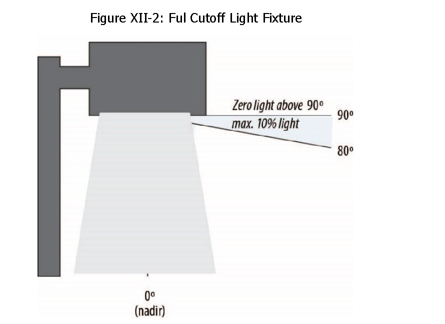 Light-producing elements must be shielded with full cutoffs so that no light emitted directly from the lamp or indirectly from the fixture is projected at an angle of more than 90 degrees above nadir and no more than ten percent of the light emitted directly from the lamp or indirectly from the fixture is projected at an angle of more than 80 degrees above nadir.