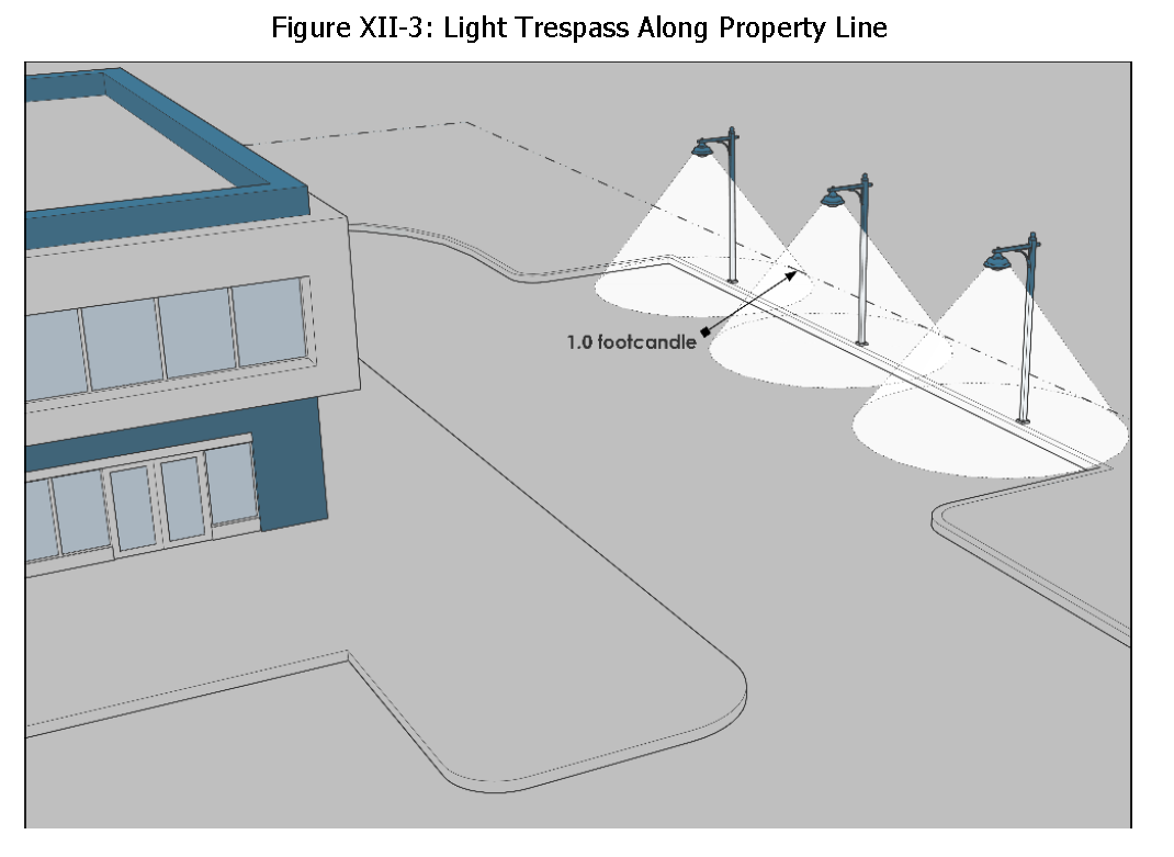 Light trespass. Light trespass along the lot line of the subject property may not exceed 0.5 foot-candles when abutting a residential zoning district or 1.0 foot-candle when abutting any other zoning district or public right-of-way. B-1(A)- and B-1-zoned lots are exempt from the light trespass limitations of this section except when such lot abuts an R-zoned lot.