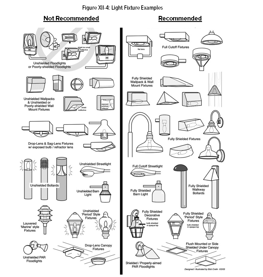 All lighting fixtures, except motion detector-activated lighting, must be fully shielded so that the lighting element is not visible to an observer at any property line, as measured five feet above grade (see Figure XII-4 for examples)