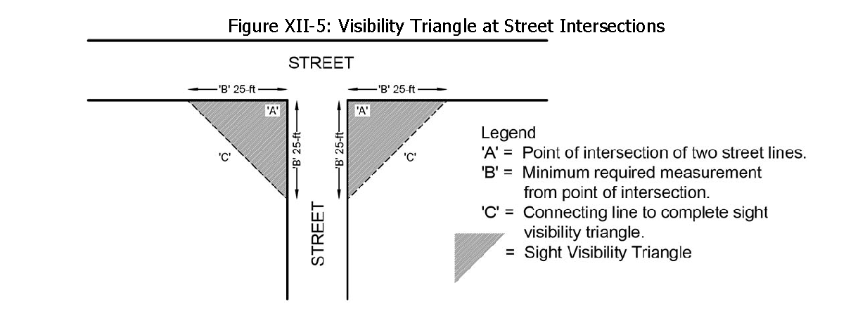 Intersection of streets. The sight visibility triangle at the intersection of two streets is formed with two sides 25 feet in length along the abutting street rights-of-way lines (illustrated by the letter "B" in Figure XII-5), measured from their point of intersection (illustrated by the letter "A" in Figure XII-5), and the third side being a line connecting the ends of the other two sides, illustrated by the letter "C" in in Figure XII-5.