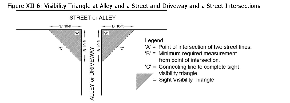 Intersection of an alley and a street or a driveway and a street. The sight visibility triangle at the intersection of an alley and a street or a driveway and a street is formed on both sides of the alley or driveway with two sides of each triangle being ten feet in length along the abutting street right-of-way lines, measured from their point of intersection, illustrated by the letter "A" in Figure XII-6, and the third side being a line connecting the ends of the other two sides, illustrated by the letter "C" Figure XII-6.