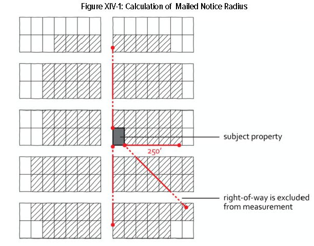 Unless otherwise directed by the zoning administrator, whenever the provisions of this article require mailed notice, the applicant must provide mailed notice to owners of the subject property and all owners of property within 250 feet of the property lines of the subject property, as measured from the property line to property line, but excluding public rights-of-way (i.e., rights-of-way are not counted in calculating the required notification radius). See Figure XIV-1