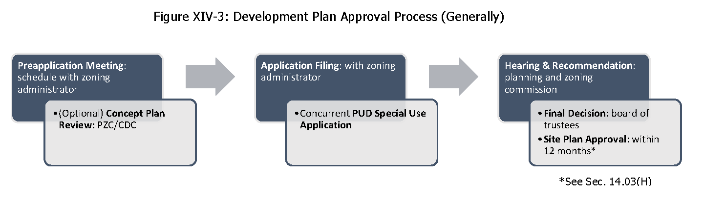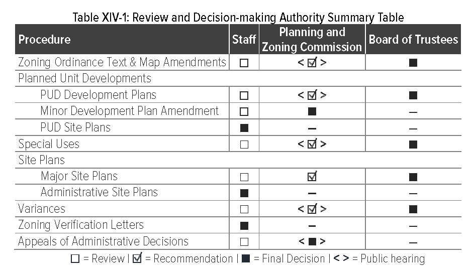 Review and decision-making authority (summary table). Table XIV-1 provides a summary of the review and approval procedures of this article. In the event of conflict between this summary table and the detailed procedures contained elsewhere in this article, the detailed procedures govern.