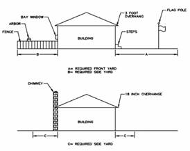 In all yards. Open at-grade terraces and patios, chimneys (maximum projection eighteen inches), fences.