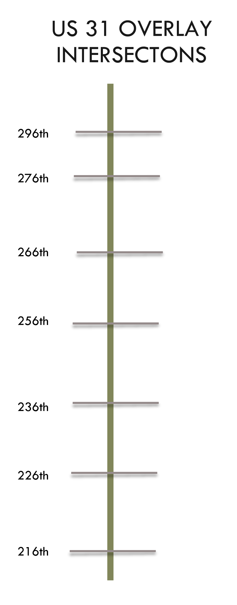 US 31 frontage (access) roads. Frontage/access roads adjacent/parallel to the US 31 corridor are discouraged.