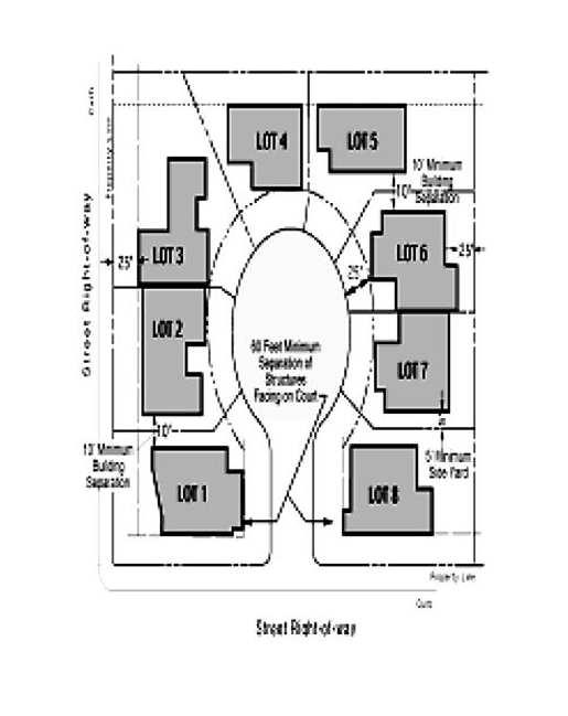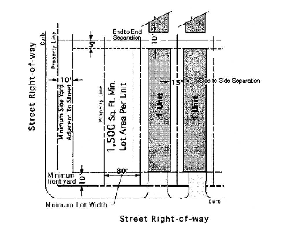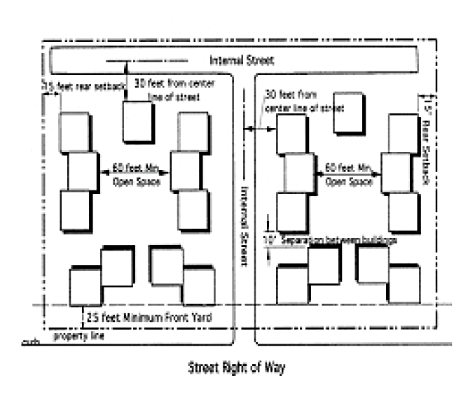 For any residential structures having configurations and locations other than that for townhouses or row houses, they shall be arranged so that there will be a clearance of not less than ten feet between the side of any one structure and the side of the structure adjacent to it, and there shall be a front yard of not less than 25 feet for every dwelling unit.