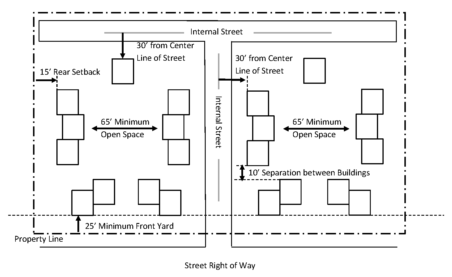 Buildings adjacent to public streets which are internal to a townhouse development shall be set back not less than 25 feet from the centerlines of said streets.
