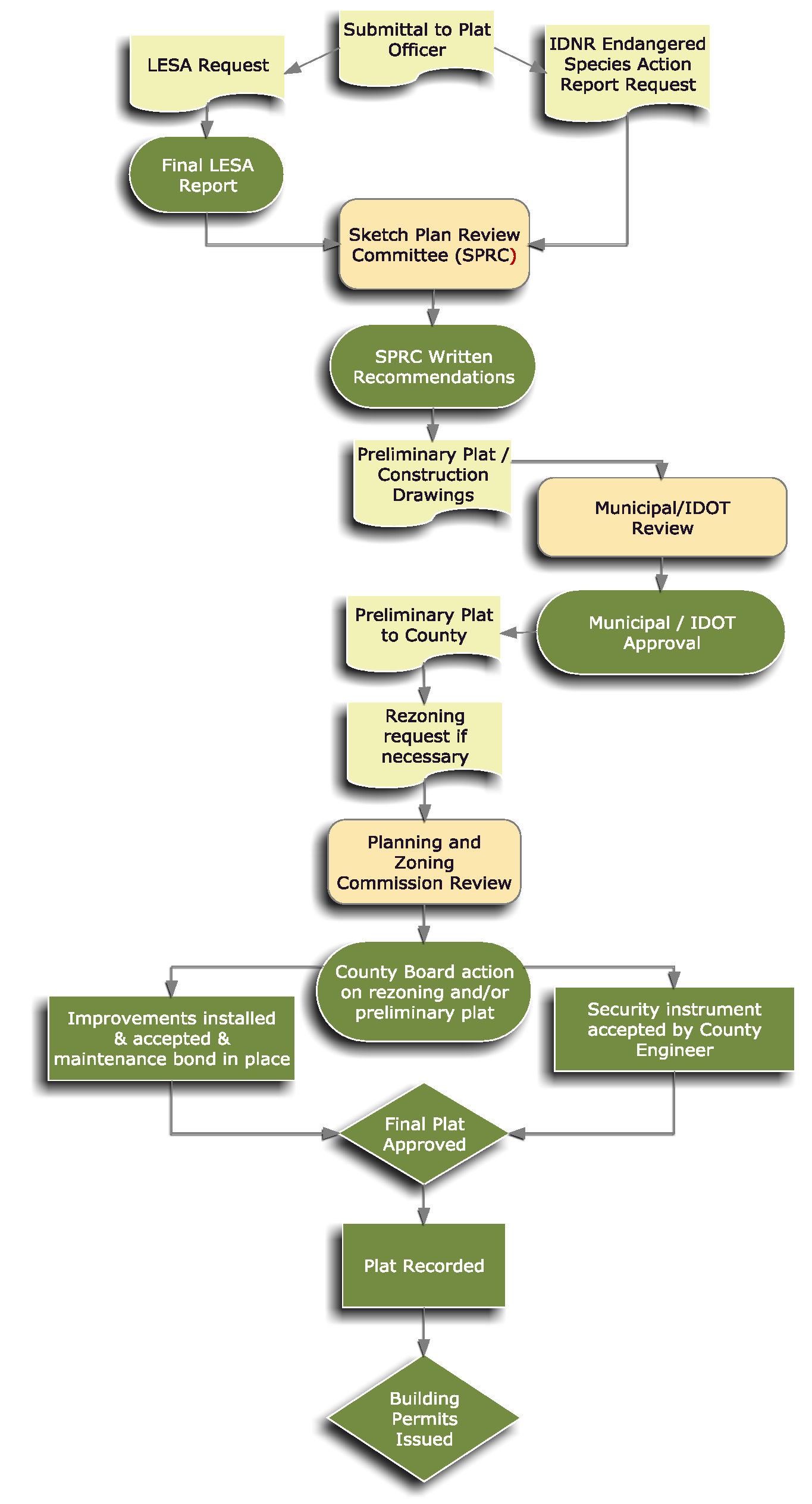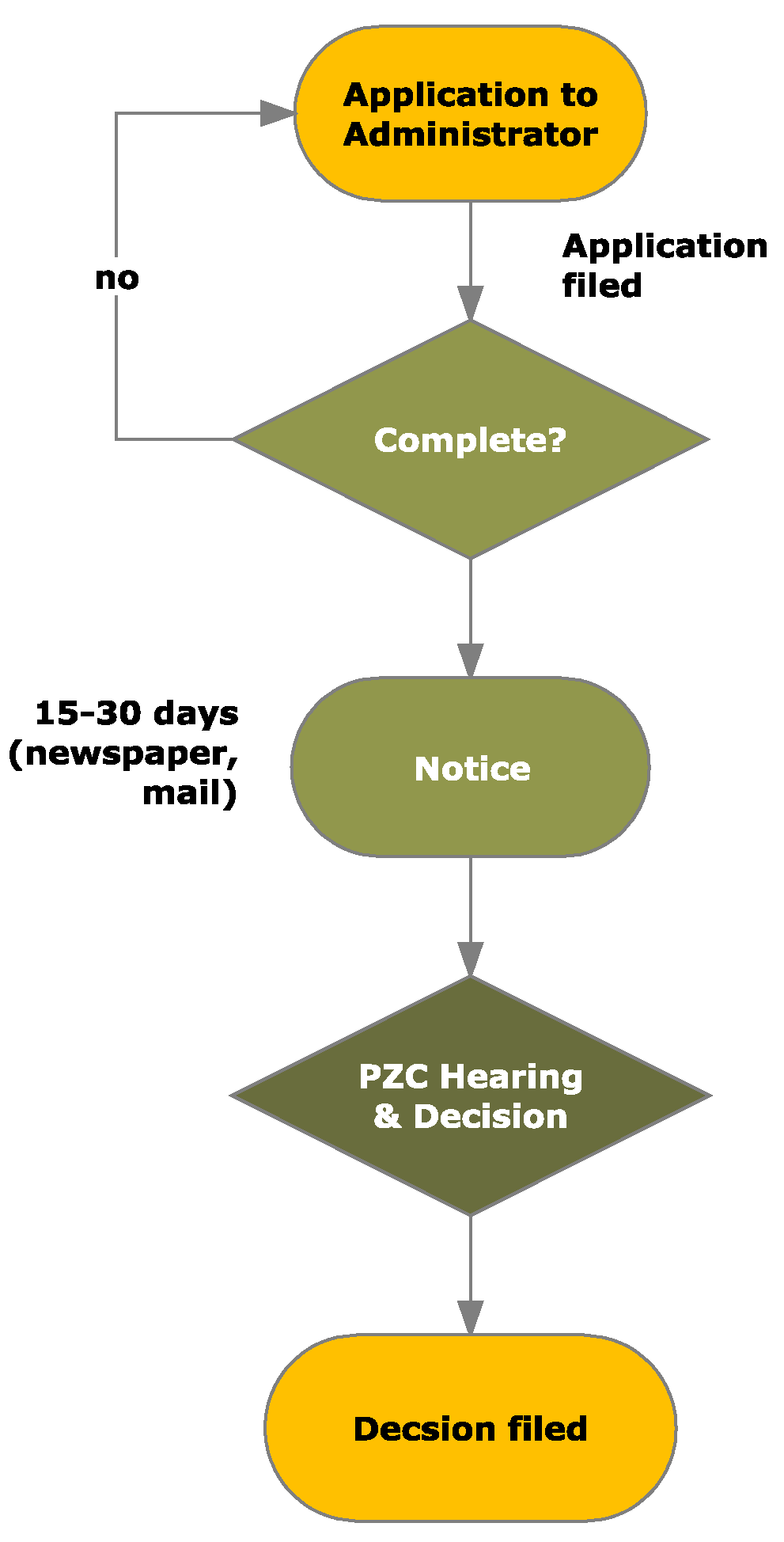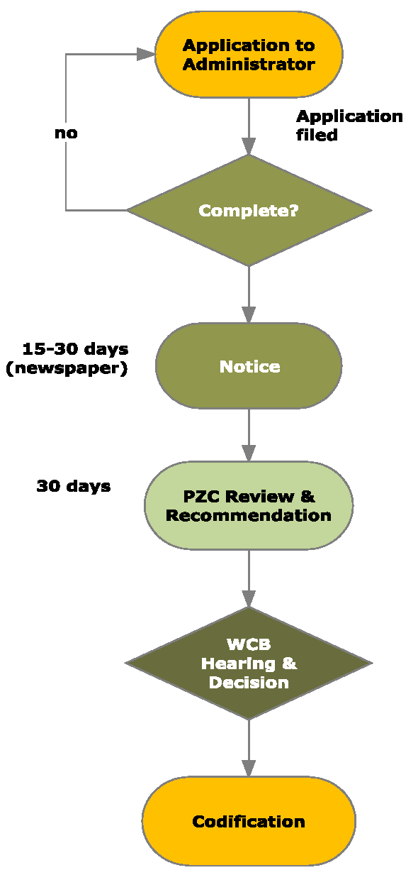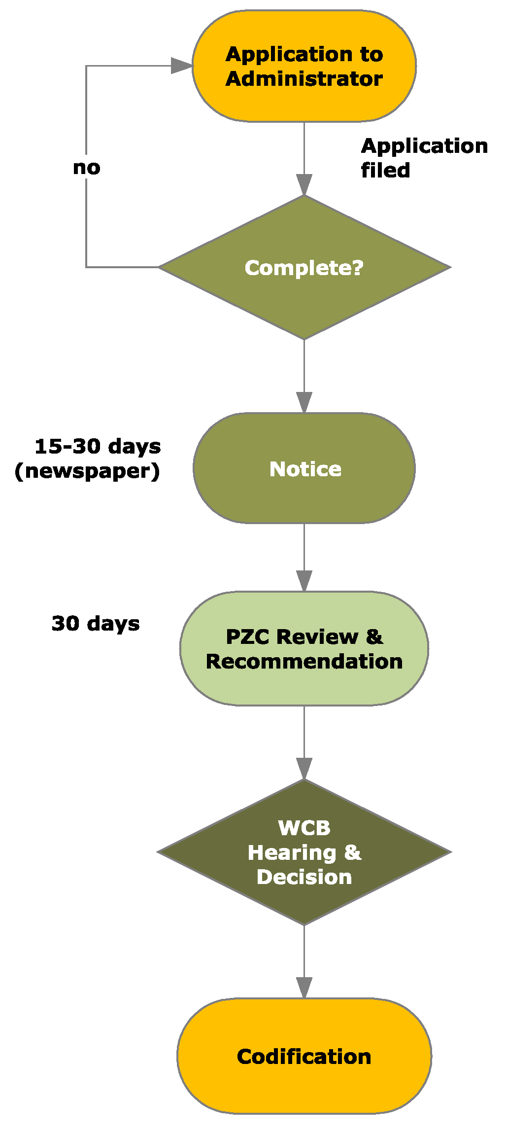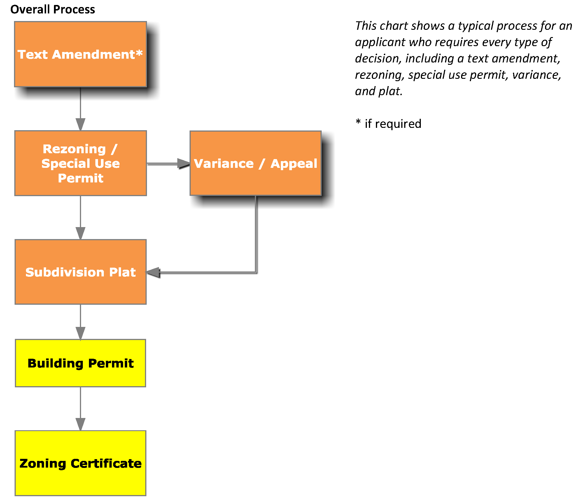 This chart shows a typical process for an applicant who requires every type of decision, including a text amendment, rezoning, special use permit, variance, and plat.