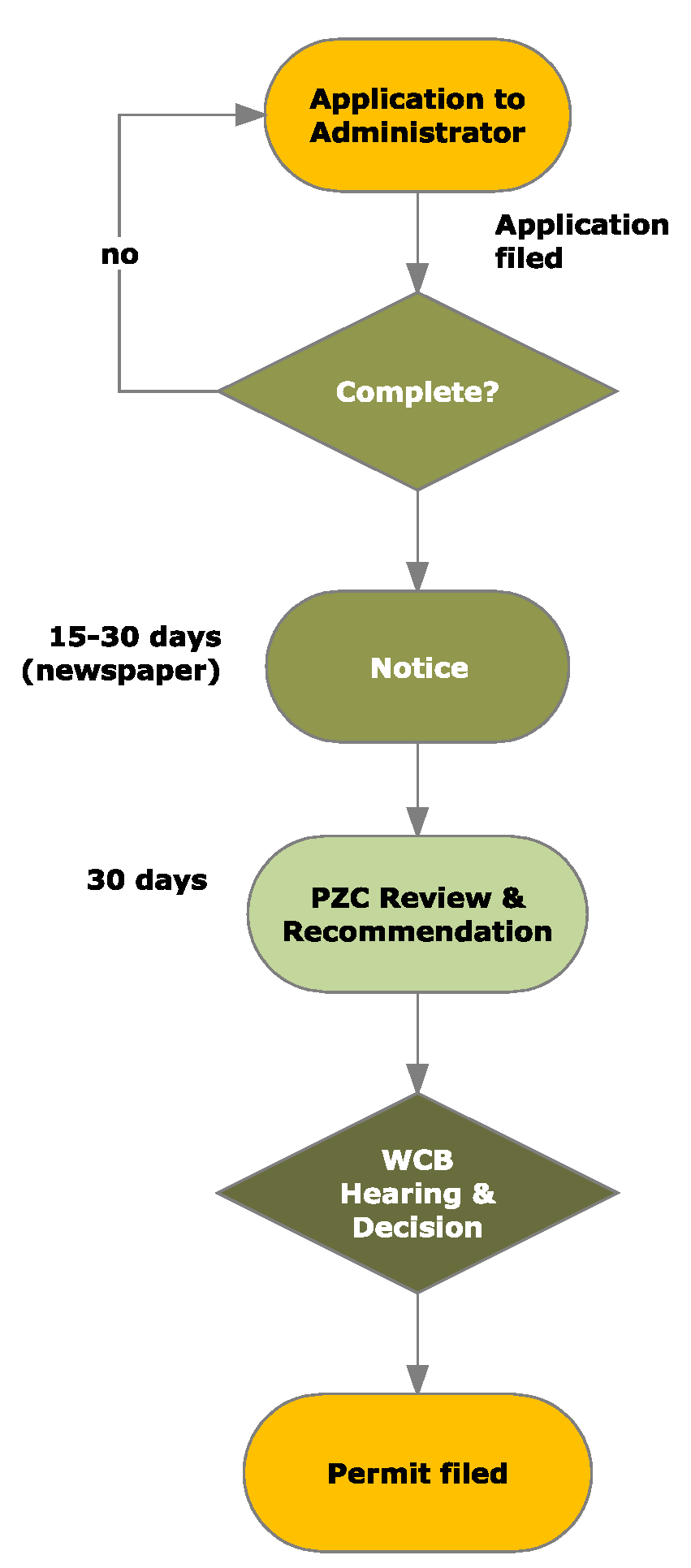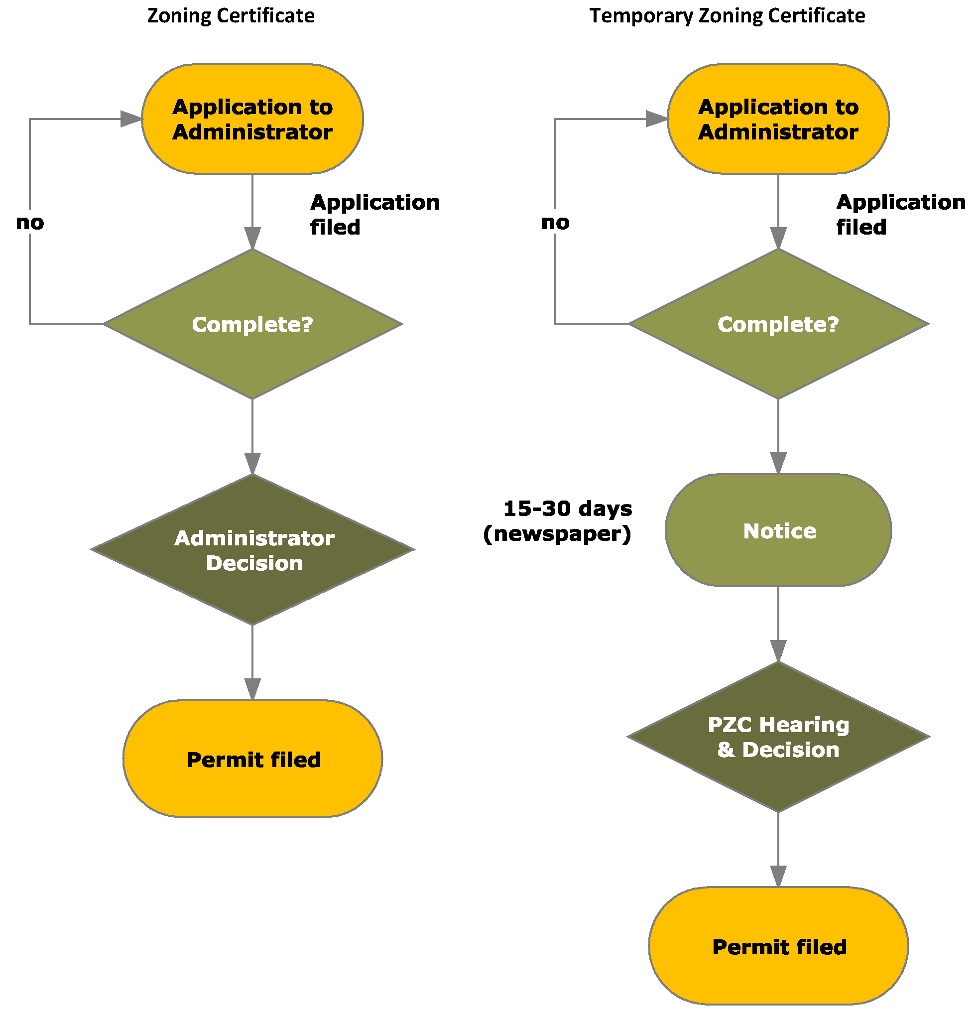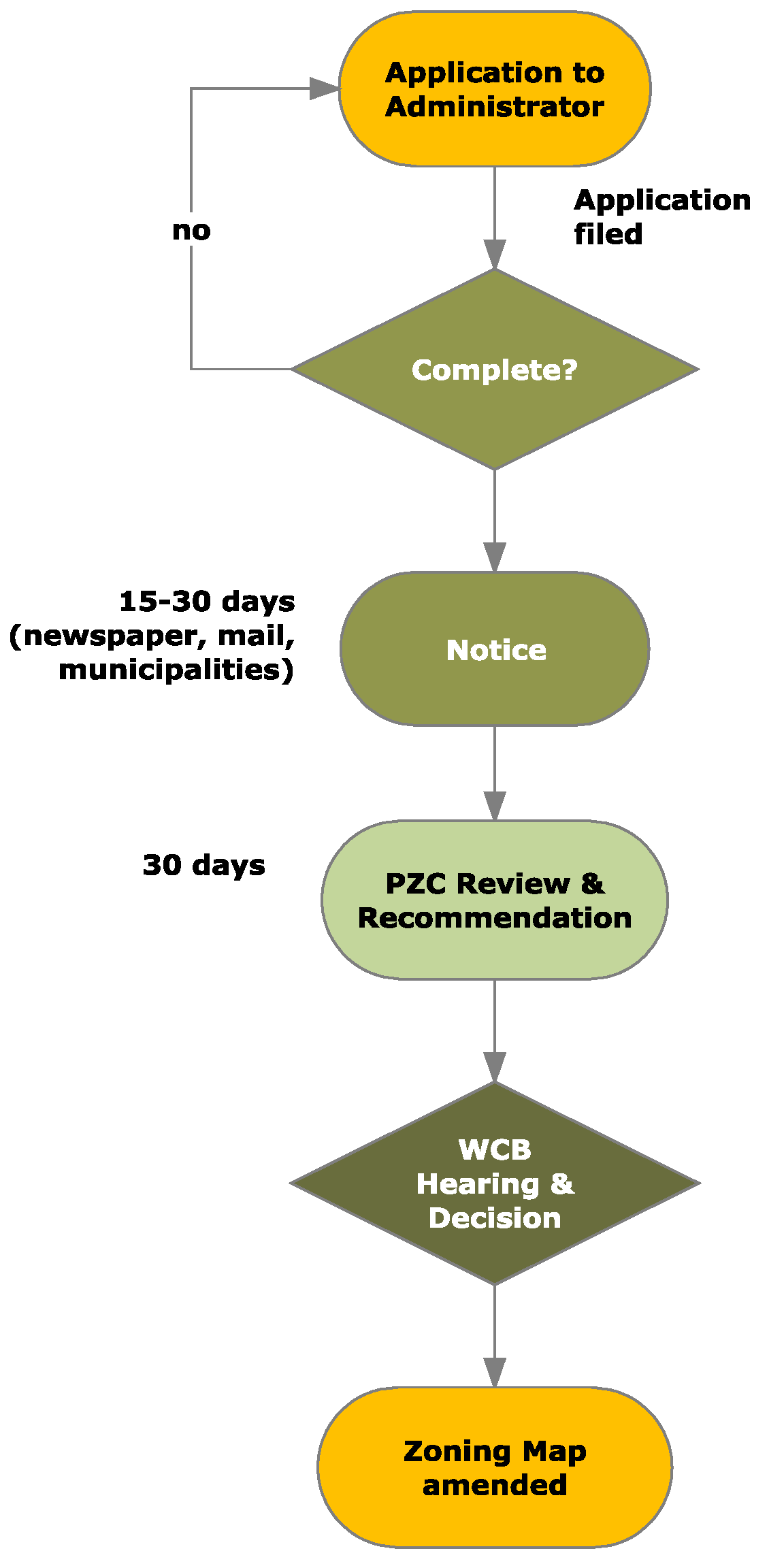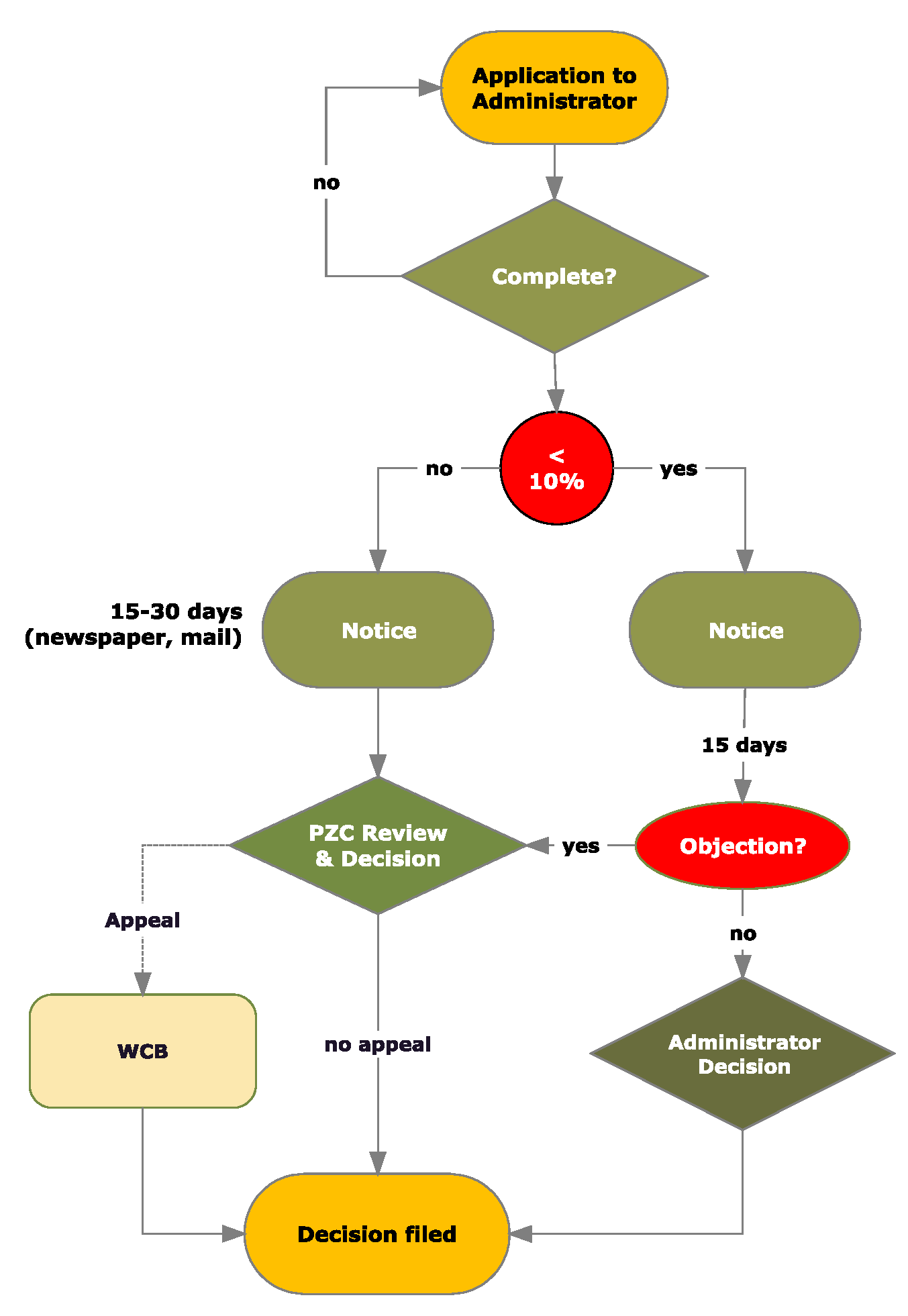This chart shows a typical process for an applicant who requires every type of decision, including a text amendment, rezoning, special use permit, variance, and plat.