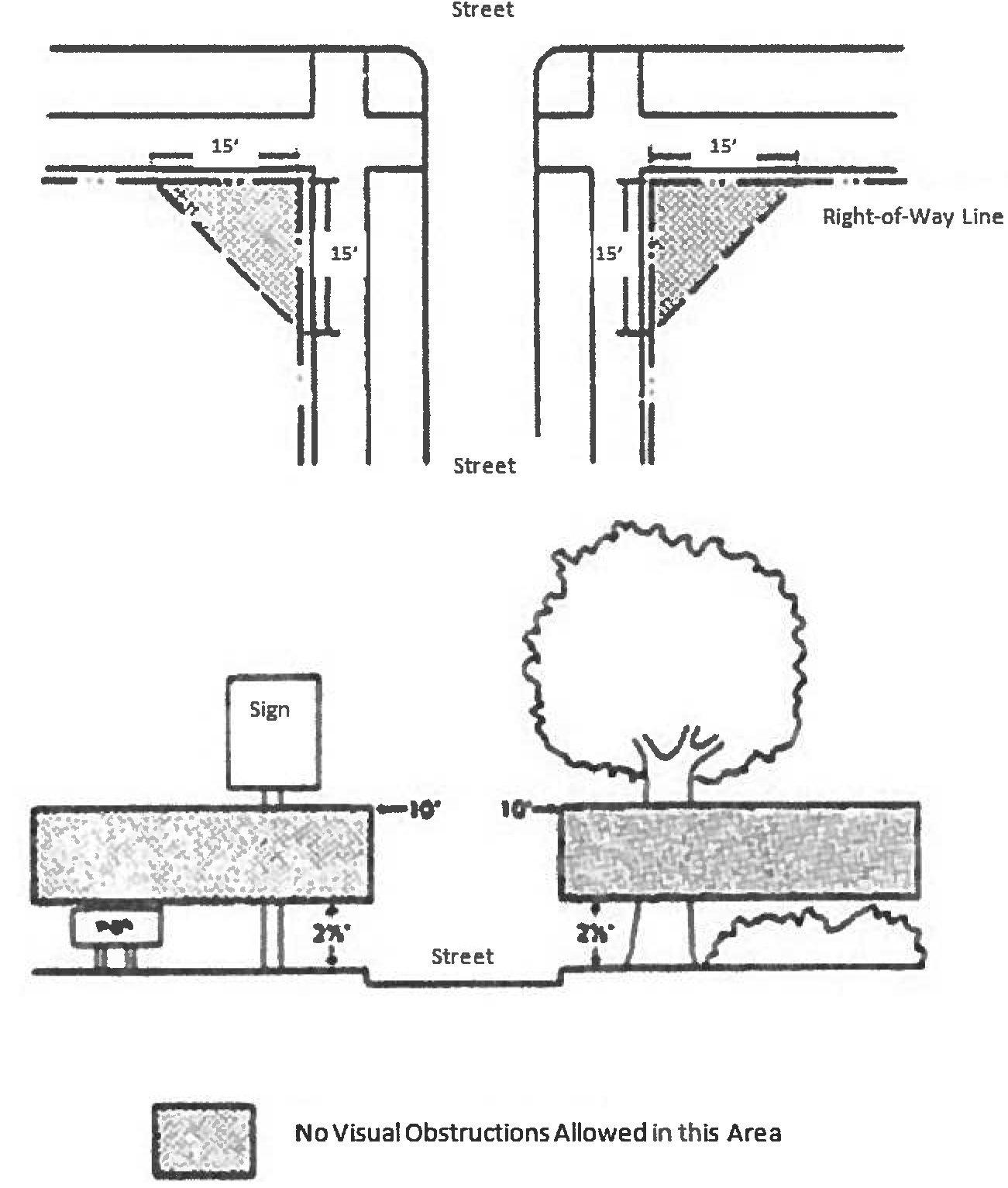 At all intersections of streets or alleys, no fence, hedge, wall, sign or other structure shall be erected, placed, planted or allowed to grow in such a manner as to collectively impede more than fifteen percent of the vision area between a height of two and one-half feet and ten feet above the established curb level of the intersection of streets or alleys in the area bounded by the right-of-way lines and a line joining points along the right-of-way fifteen feet from the point of intersection. (Refer to diagram below.)