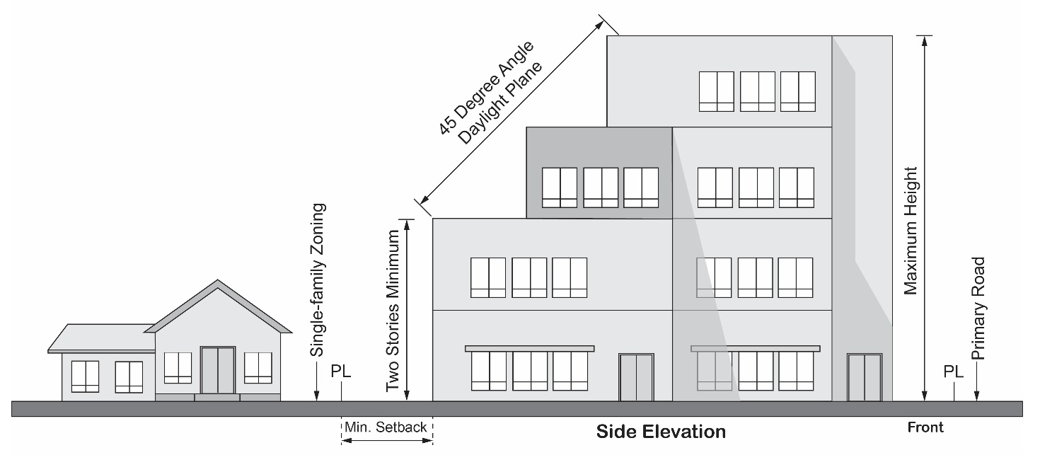 Building Step Back Requirement. Buildings located on MED zoned parcels shall provide transition, a stepping back of the building at the third story and above, that is in addition to the minimum side and rear setback line. Taller elements of the building shall increasingly step back from adjacent single-family zones. No portion of the building, excluding parapets, shall extend above an imaginary plane drawn at the property line that is adjacent to the single-family zone, and extended at an angle of forty-five degrees toward the center of the MED zoned parcel as shown in Figure 18.37.030-B.