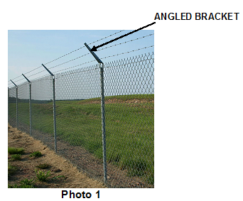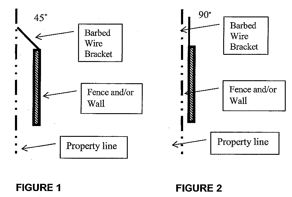 The barbed or razor wire shall be supported by brackets attached at a 45 to 90 degree angle to the face of the wall or fence it is placed on (See Figure Nos. 1 and 2).