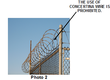 That the fence or wall upon which the barbed wire or razor wire is placed is no less than six feet above the ground level;
