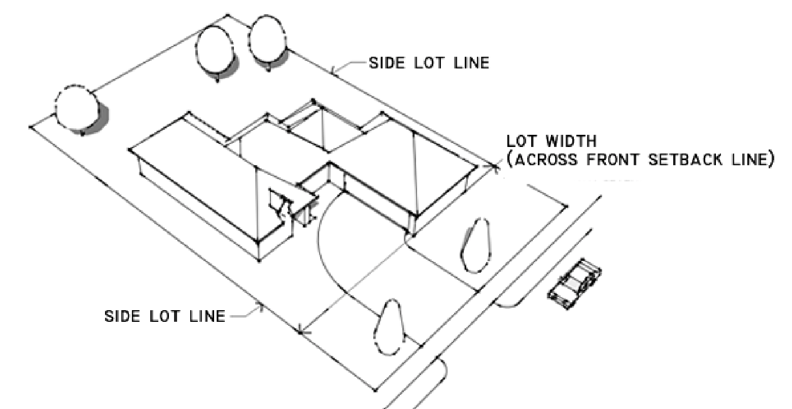 Generally. Lot width is the distance from one side lot line to the opposite side lot line at the front setback line. See Figure 17.06.290.2A, Measurement of Lot Width; Standard Lots: