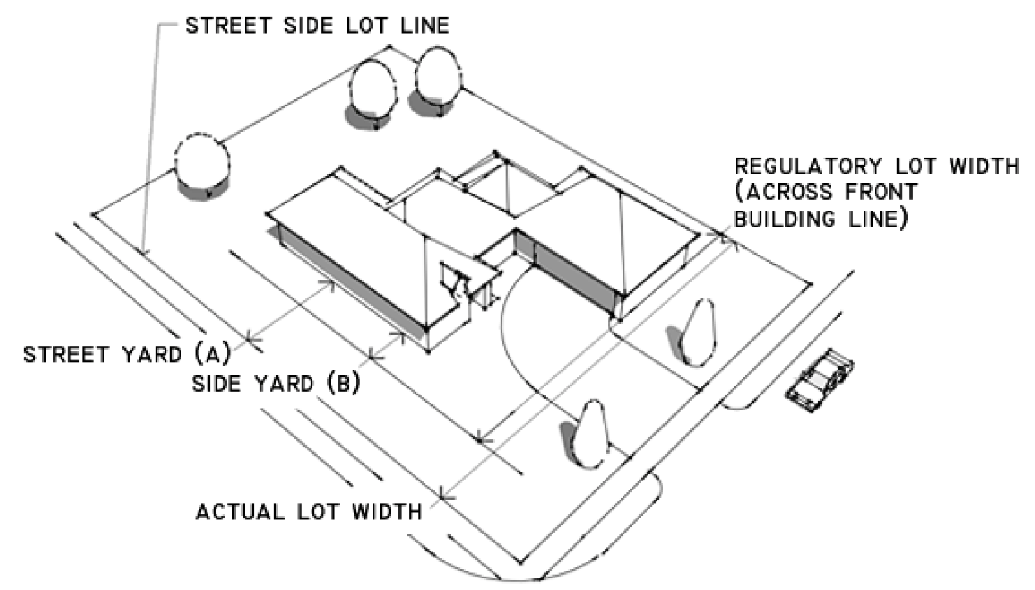 Corner lots. Lot width (for regulatory purposes) is the distance from the interior side lot line to the side street lot line, measured at the front building line, minus the difference between the street yard setback and the side yard setback. See Figure 17.06.290.2B Measurement of Lot Width; Corner Lots: