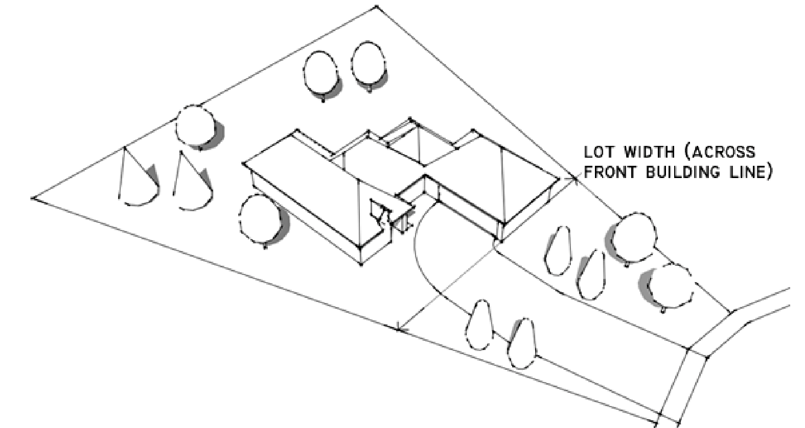 Irregular lots. Lot width is the distance from one side lot line to the opposite side lot line along the tangent of the curve representing the front building line. See Figure 17.06.290.2C Measurement of Lot Width; Irregular Lots. Generally, the front building line is the front setback line. However, if an alternative front building line has been established on the plat of a subdivision that is more distant than the front setback line from the front property line, then the lot width is measured at the alternative front building line.