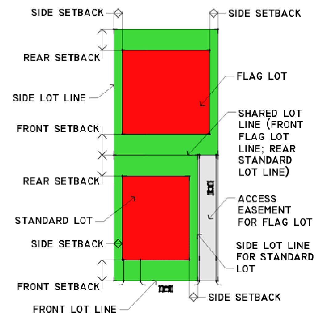 Flag lots. On flag lots, setbacks are measured as provided in subsection A., above, except that the front setback line is measured from the "shared lot line." See Figure 17.06.290.3, Setback Measurement: