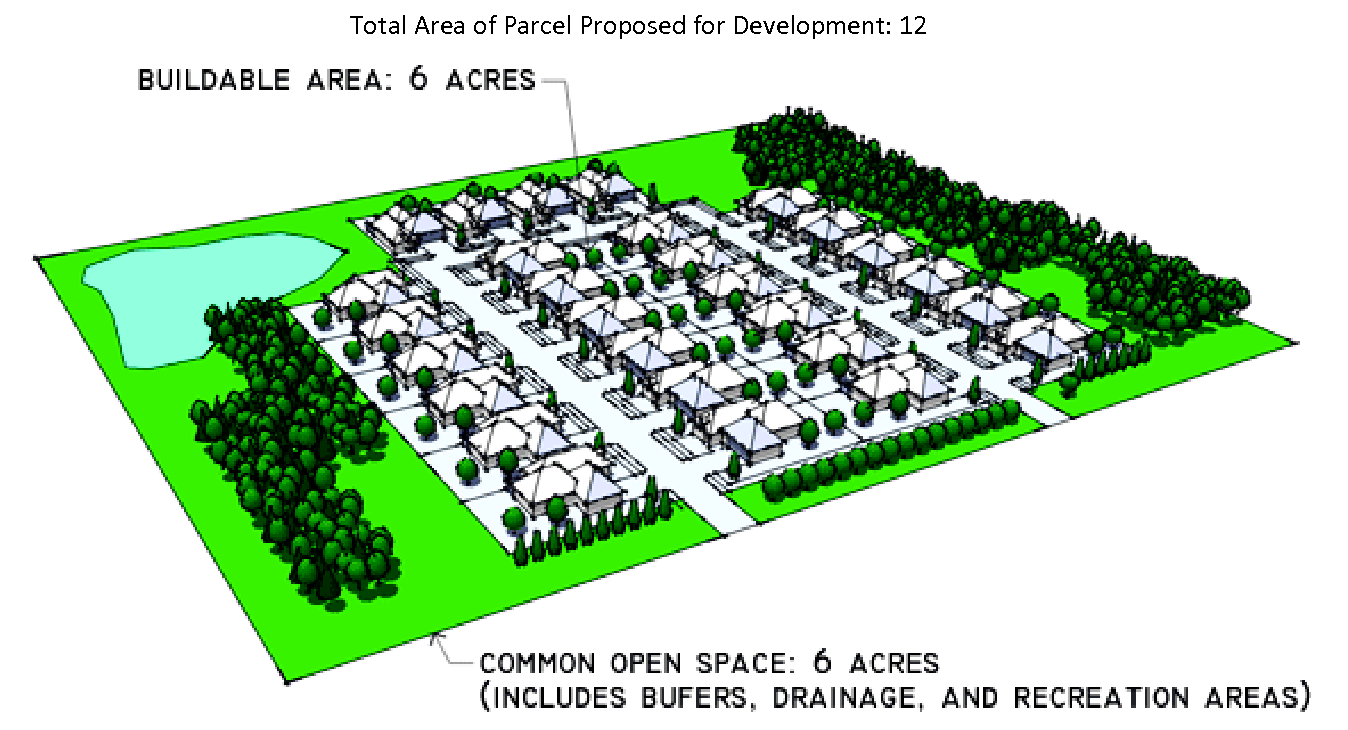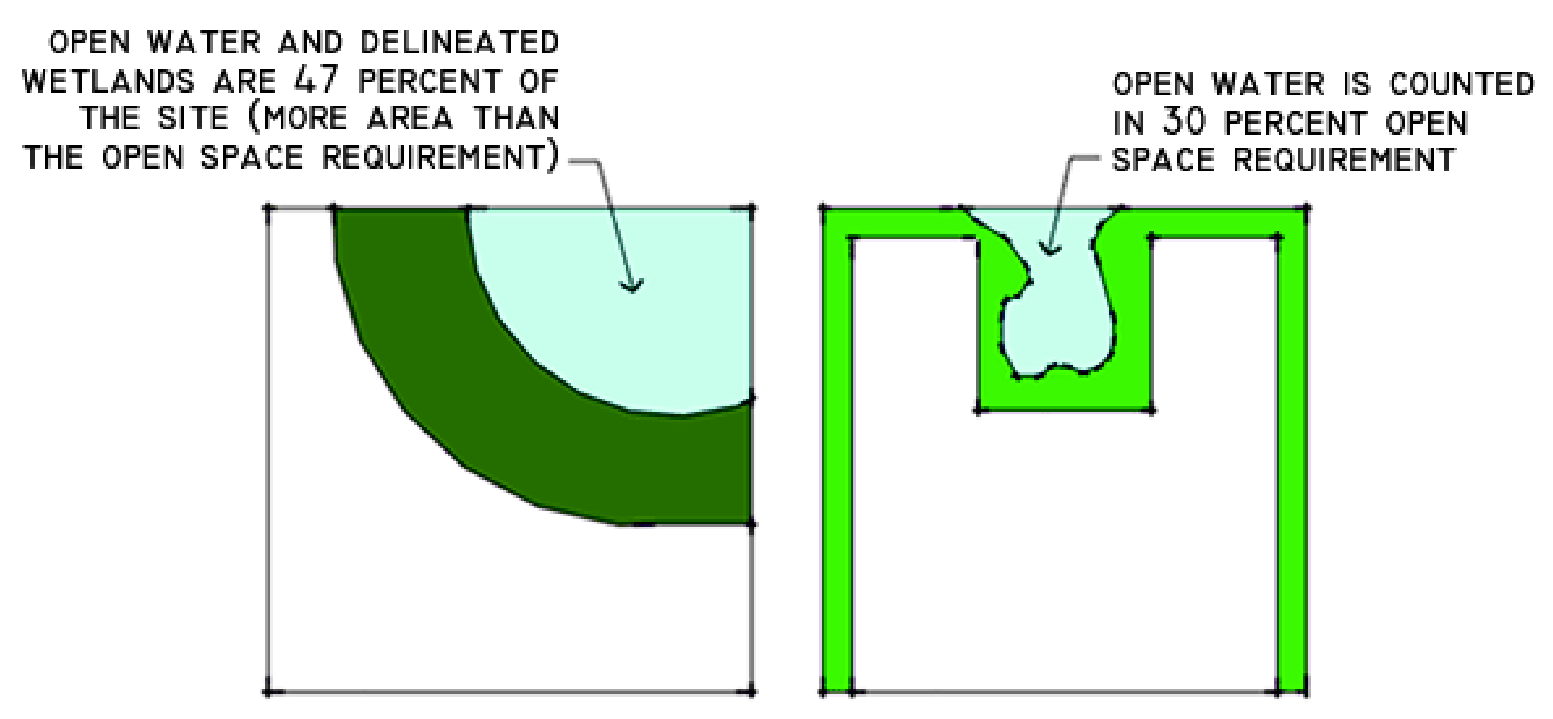 Using a thirty percent open space ratio for illustrative purposes, the net buildable area for the illustration on the left is calculated as base site area minus areas of open water and delineated wetlands; and the net buildable area for the right-hand illustration on the right is calculated as the total area of the parcel proposed for development minus the area of required open space.