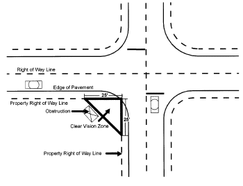 No vehicular access point shall be constructed in the radius return (curved arc between intersecting street pavements) of an intersection.