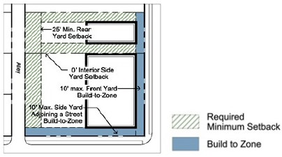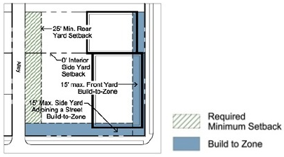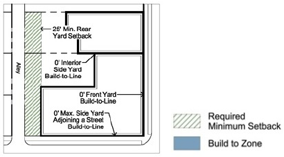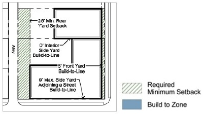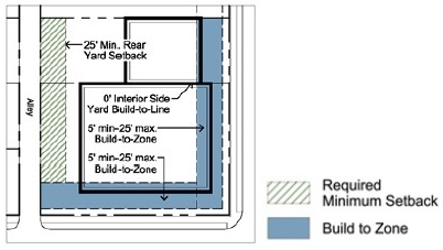 Minimum interior side yard setbacks shall be zero (0) feet, except when side building pedestrian access is provided along an adjacent building. In this case, the interior side yard facade shall be setback a minimum of five (5) feet and a maximum of ten (10) feet from the existing adjacent building facade.