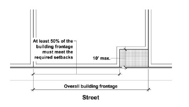 The front yard may be increased to a maximum of ten (10) feet if a courtyard, plaza or seating area is incorporated into the development adjacent to the public street. At least fifty percent (50%) of the building frontage must meet the required setbacks. (See Figure 10-10: Overall Building Frontage Diagram.)