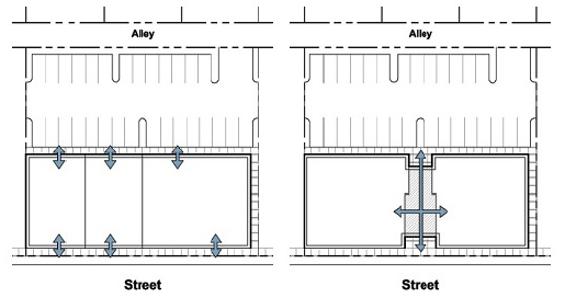 Multiple-tenant commercial buildings, including the ground floor of mixed-use buildings, may include an individual entry for each tenant, or a primary lobby entrance that provides internal access to individual tenants. (See Figure 10-13: Permitted Commercial Building Entry Access.)