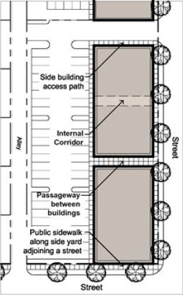 Permitted pedestrian access paths may include the following (See Figure 10-14: Permitted On-Site Pedestrian Paths):
