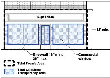 Ground Floor Transparency. Ground floor facades for single-story commercial and mixed use projects shall include a minimum of forty percent (40%) clear glass (no tinting) that allows full view into the facility. This requirement applies to any portion of the exterior wall facade that separates the exterior from a publicly accessible interior space (i.e., restaurant seating area, retail display area, etc.) Exterior walls that enclose private areas, such as kitchens, storage, articulated entries to upper story residential units, are not required to conform to the fenestration regulation. The percent of ground floor transparency is calculated as the total window and door area (not including mullions) divided by the total facade area between the ground plane and the awning/signage frieze. (See Figure 10-15: Facade Transparency Measurement Diagrams.)