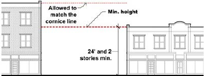 Pedestrian Frontage, Infill Building Relationships. Infill buildings must match the height of an adjacent building or be at least twenty-four (24) feet in height and two (2) stories. (See Figure 10-16: Infill Building Context.)