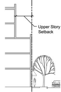Pedestrian Frontage Design Regulations. The facades of the bottom three (3) stories shall be within the permitted build-to-zone. Stories above the third story may be setback beyond the build-to-zone. (See Figure 10-17: Upper Story Setback.)