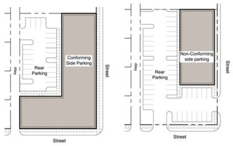 Parking Lot Layout. For commercial or mixed-use projects, one (1) aisle of parking is permitted to the side of or between primary buildings, subject to meeting all other pertinent conditions of this Article. No parking lot located at grade may be located within twenty-five (25) feet of a lot line adjoining a street along a pedestrian frontage, and ten (10) feet of a lot line adjoining a street along an arterial frontage. (See Figure 10-21: Permitted Side Parking Aisles.)