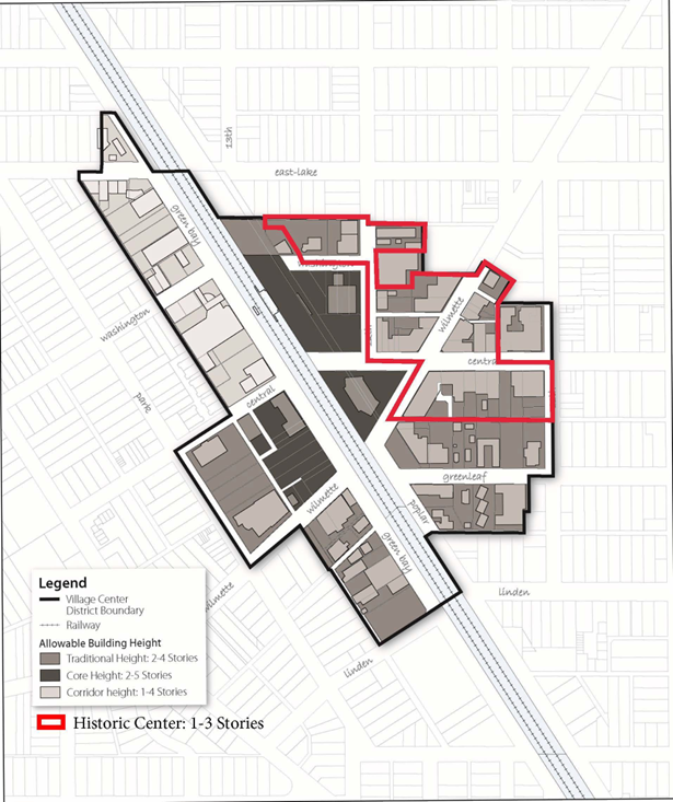 The purpose of the VC, Village Center District is to promote a transit oriented, mixed use, walkable village center. The VC District is designed to accommodate pedestrian-oriented development in the Village core as well as development oriented to both pedestrian and motorist along Green Bay Road at the gateways leading into this area. The design regulations of the VC District are of critical importance to the image of the Village and are more specific than those provided elsewhere in this Ordinance.