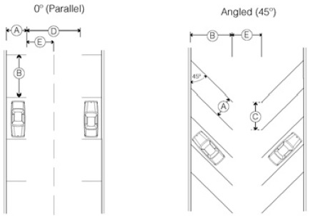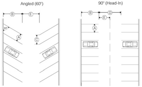 Driveways, off-street parking areas and access aisles for multi-family residential and non-residential parking lots must be designed in accordance with Figure 14-1: Off-Street Parking Dimensions.
