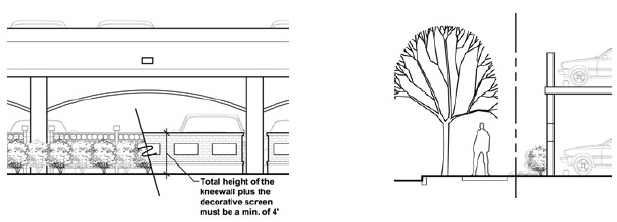 On portions of the ground floor facade where parking spaces are visible, a decorative screen shall be provided atop the knee wall to screen traffic and pedestrians in the public right-of-way from headlight glare. The total height of the knee wall and decorative screen shall be a minimum of four (4) feet. (See Figure 14-5: Parking Structure Ground Floor Decorative Screening.)