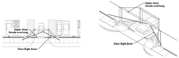 The facade of vehicular exit areas shall be setback from the public sidewalk a minimum of eight (8) feet setback for the portion of the facade that includes the vehicle exit area and eight (8) linear feet on each side of the exit opening.