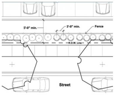 One (1) shrub, measuring a minimum of eighteen (18) inches at planting and not to exceed three and one-half (3 1/2) feet at maturity, shall be planted for every three (3) feet of landscape area length, spaced linearly to adequately screen vehicle bumpers. Alternatively, a low pedestrian wall the height of which provides effective screening to a maximum height of three (3) feet may be used instead of shrubs. Where feasible, plant materials should be installed between the sidewalk and the wall to provide a softening effect on the fence or wall.
