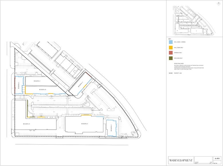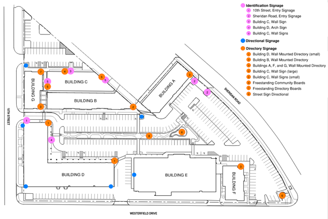 One (1) street sign style Directional Sign indicating the location of specific tenants may be displayed and located in the central landscape island between Buildings B and D.