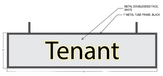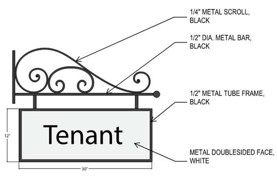 All Projecting Signs shall be constructed of a black metal frame with white, double-sided face. Sign letters applied to the face to be black acrylic, vinyl or metal.