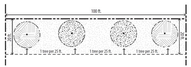 One tree per 20 lineal feet with a minimum of 50 percent evergreen trees.