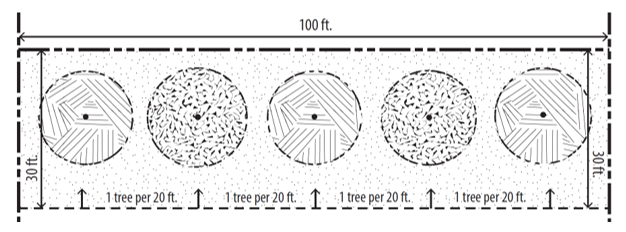 Seven trees and seven shrubs per every 100 feet of road frontage.