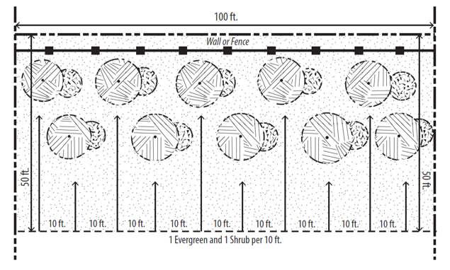 One evergreen and one shrub per ten lineal feet along the residential side of the wall or fence. At the time of planting, evergreens shall be a minimum height of five feet.