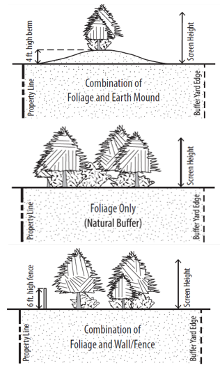 Landscaping and/or screening elements collectively consisting of trees, shrubs, fencing/walls, or berms, to a minimum screen height of ten feet and installed to 100 percent opacity. Cross-section examples of different combinations of natural and man-made features to achieve the screen height and 100 percent opacity requirements are shown at left.