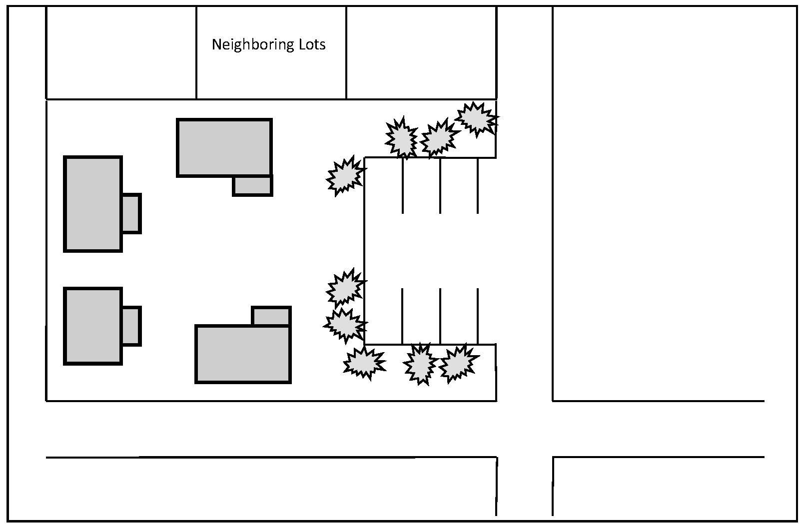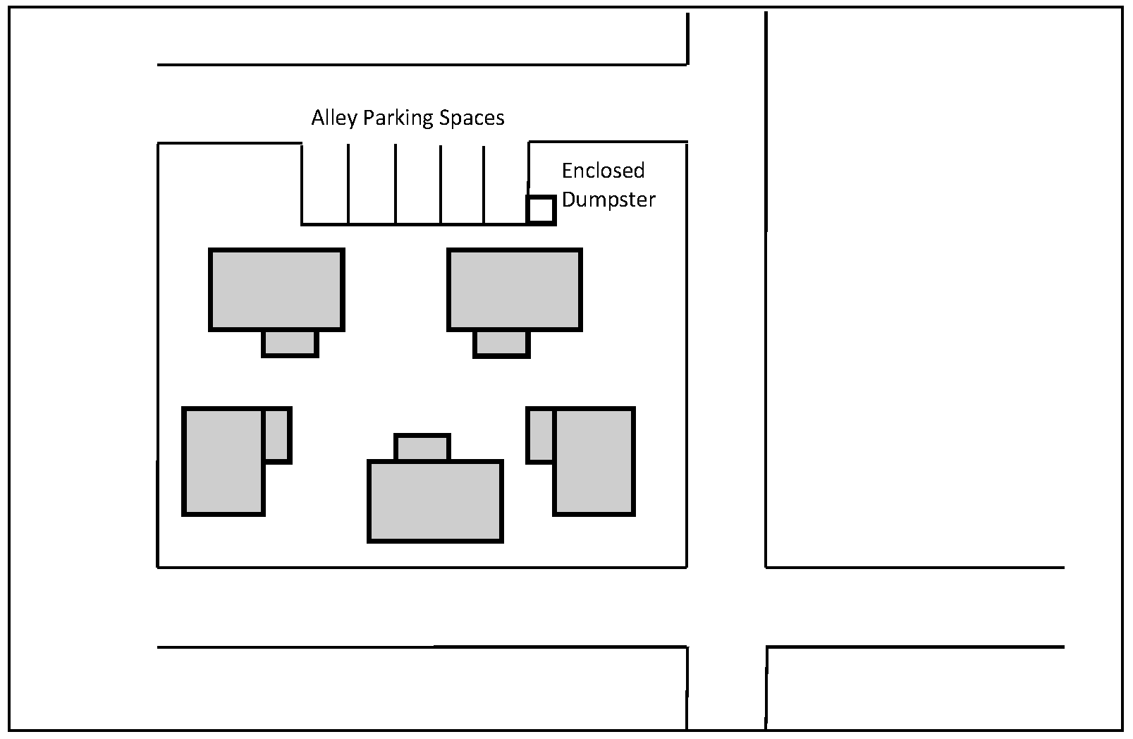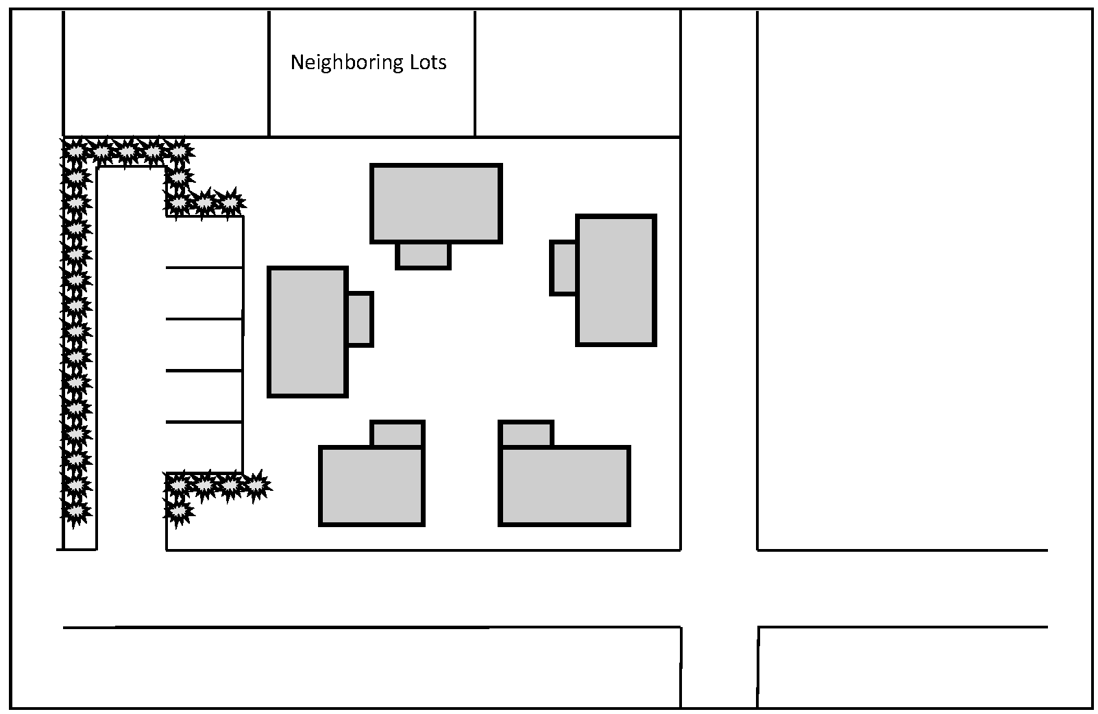 Off-Street Parking Location. Parking shall be located on the cottage housing development property. Off-street parking lots shall be located to the side or rear of the cottage housing development (see illustrations below). Parking lots shall not be located between the cottage housing development and the primary street frontage.