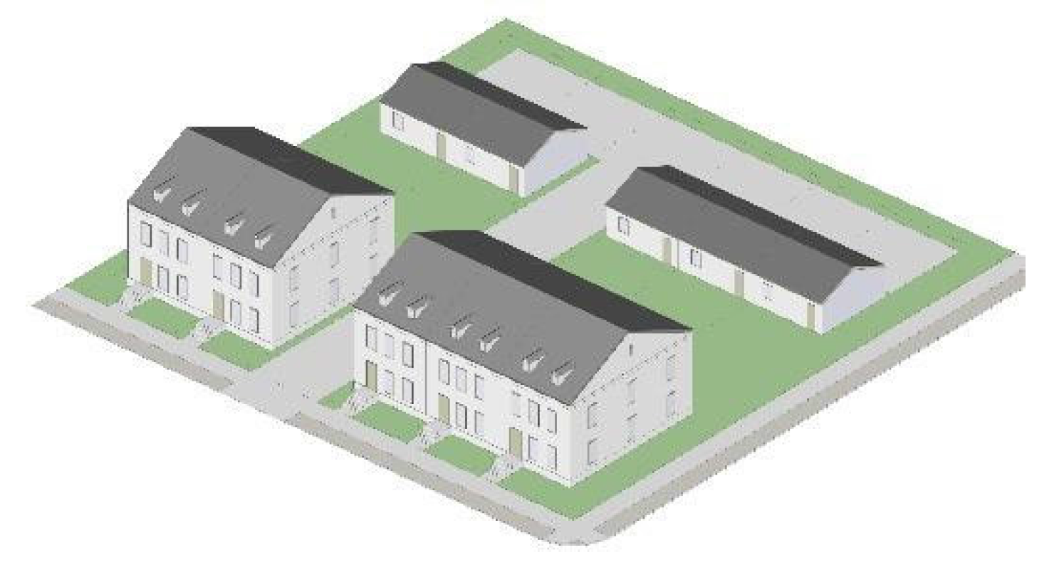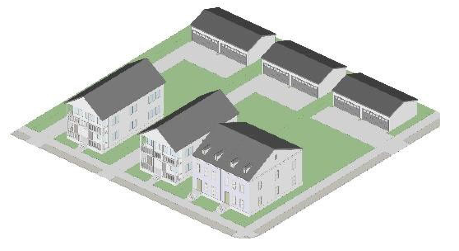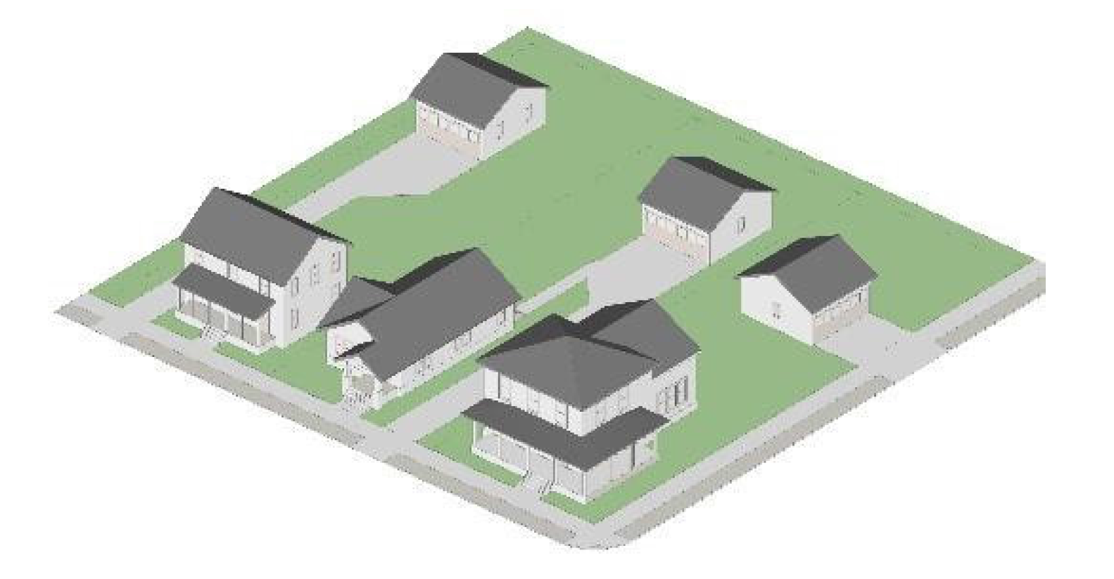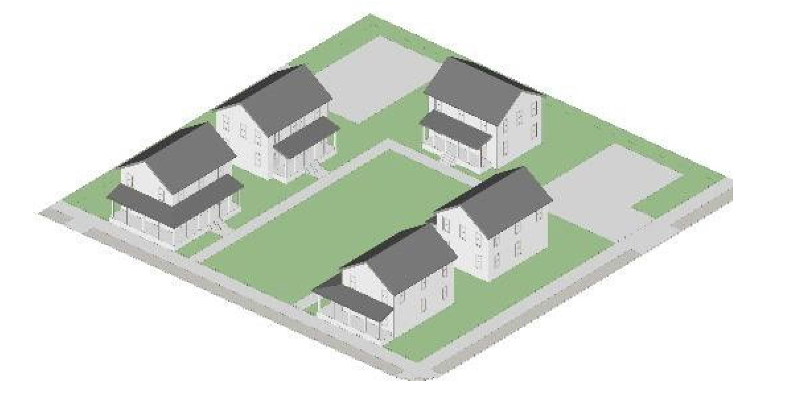 Cottage court. A building type designed to accommodate 5 to 10 detached dwelling units organized around a shared internal courtyard. Units cannot be vertically mixed. All units must front a public street or a landscaped courtyard of at least 40 feet in width and 3,000 square feet in total area. Courtyard may not be parked or driven upon, except for emergency access and permitted temporary events.
