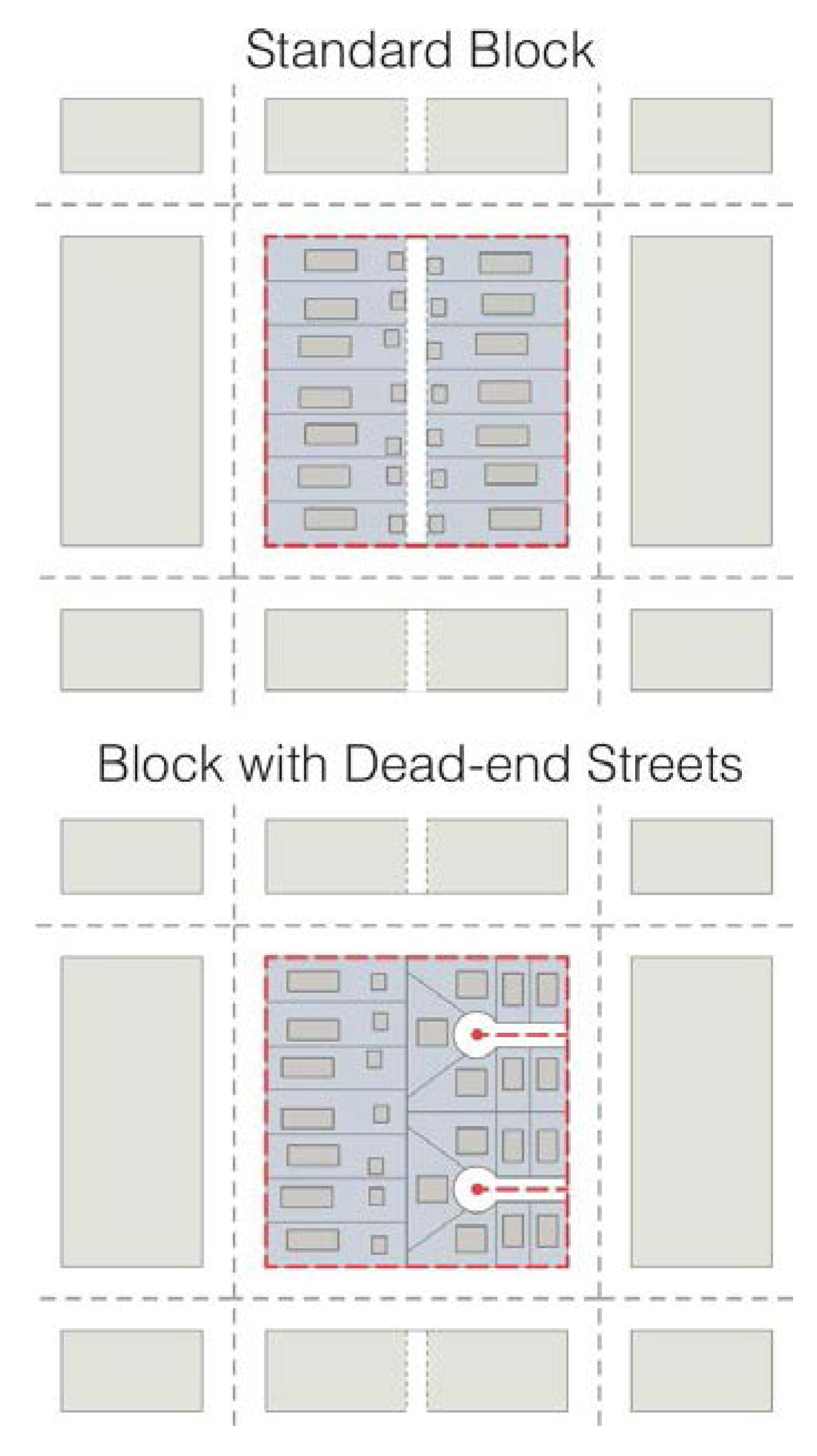 A block must be bounded by public streets. Block perimeter is measured along the edge of the property abutting a public street, except for the measurement of existing dead-end streets, which are measured from intersecting centerlines.