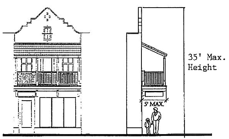 The cantilevered balcony may be roofed or framed by columns. In special, limited applications, balcony space could be enclosed to form a "jumba," but such enclosures require a special, site specific design approval by the town. A jumba may no exceed 15 feet in length.